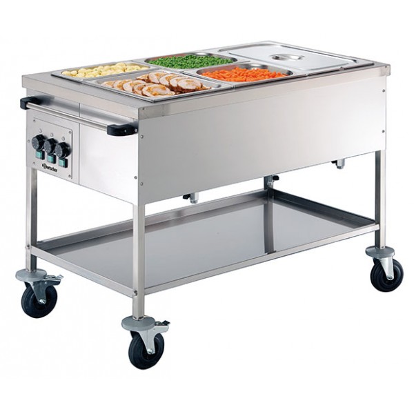 Chariot bain-marie à roulettes 3 x 1/1 GN, profondeur 150 mm, chauffé à l'eau, dimensions : L 650 x P 1200 x H 855 mm, plage de température de 0 à 90 °C, bac à double paroi avec robinet de vidange, poids 43kg, Livré sans bac GN