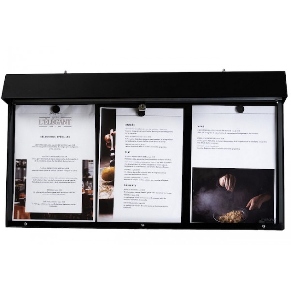 Porte-menu mural en acier zingué et peinture polyester, étanche pour un usage extérieur, porte plexiglass fermant à clé, capacité 3 feuilles A4, éclairage LED, alimentation secteur, Dimensions 700 x 100 x 400mm : Couleur RAL disponible : Noir 9005 - Vert 6005 - Rouge 3004
