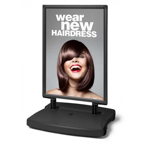 Stop trottoir noir 70x100cm double face pour affiche B1 étanche pour résister aux intempéries, ressorts acier adaptés pour résister au vent fort, base pvc à remplir d'eau ou de sable