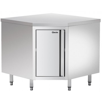 Amoire d'angle professionnelle en inox sans dosseret avec porte, dimensions : L 900 x P 900 x H 850-900 mm, étagère intermédiaire ajustable, pieds carrés de 40 x 40 mm, réglage hauteur de la table de 850mm à 900mm, poids 68kg