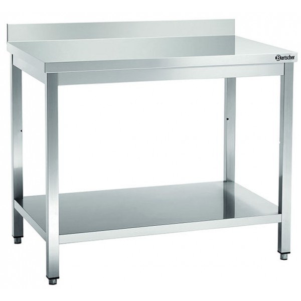 Table inox avec dosseret d'une hauteur de 100 mm en acier inoxydable, finition Skotch-Brite, dimensions : L 1600 x P 700 x H 850-900 mm, pieds carrés 40 x 40 mm, la table inox est dotée d'une sous étagère, livré en kit, montage facile, poids : 57kg